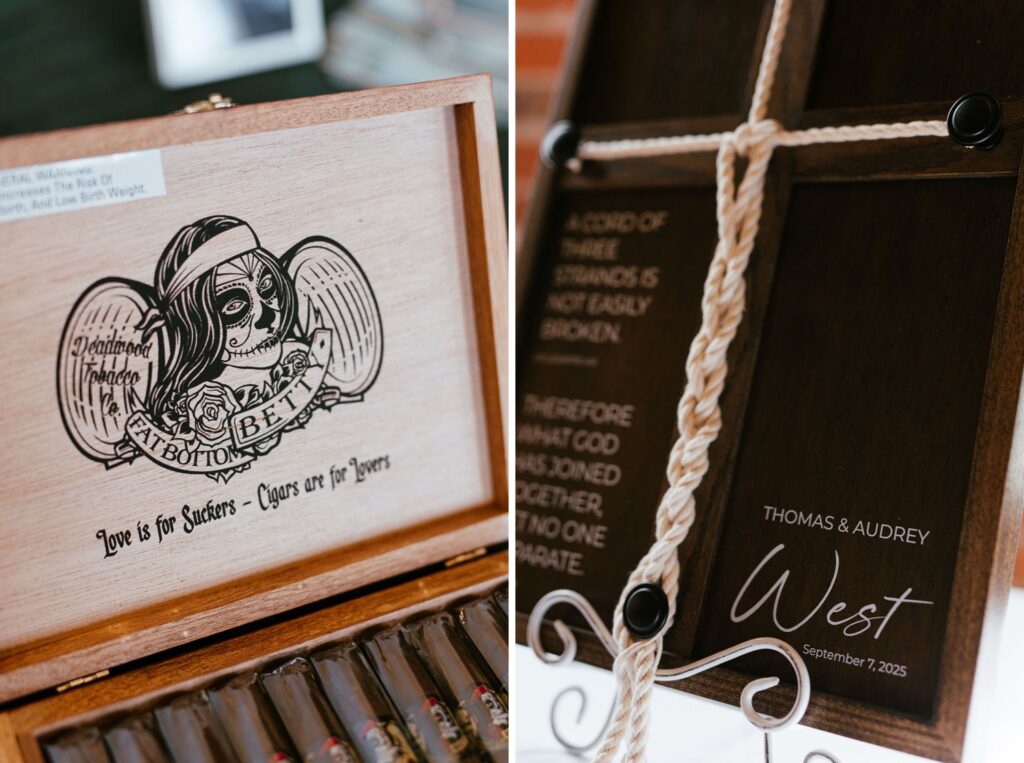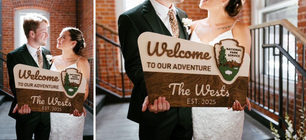 Audrey and Thomas first met running cross country and track together in high school, where their friendship sparked. After graduation, they stayed close but didn’t officially date – life had its timing! A year apart brought an unexpected reunion, and from there their story fell beautifully into place. These two are adventurous at heart, often hiking and exploring outdoors together, so it felt only fitting that their wedding day carried the same mix of energy and warmth (peep their adorable wedding day sign that they made to look like a national park sign).